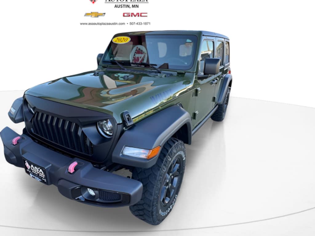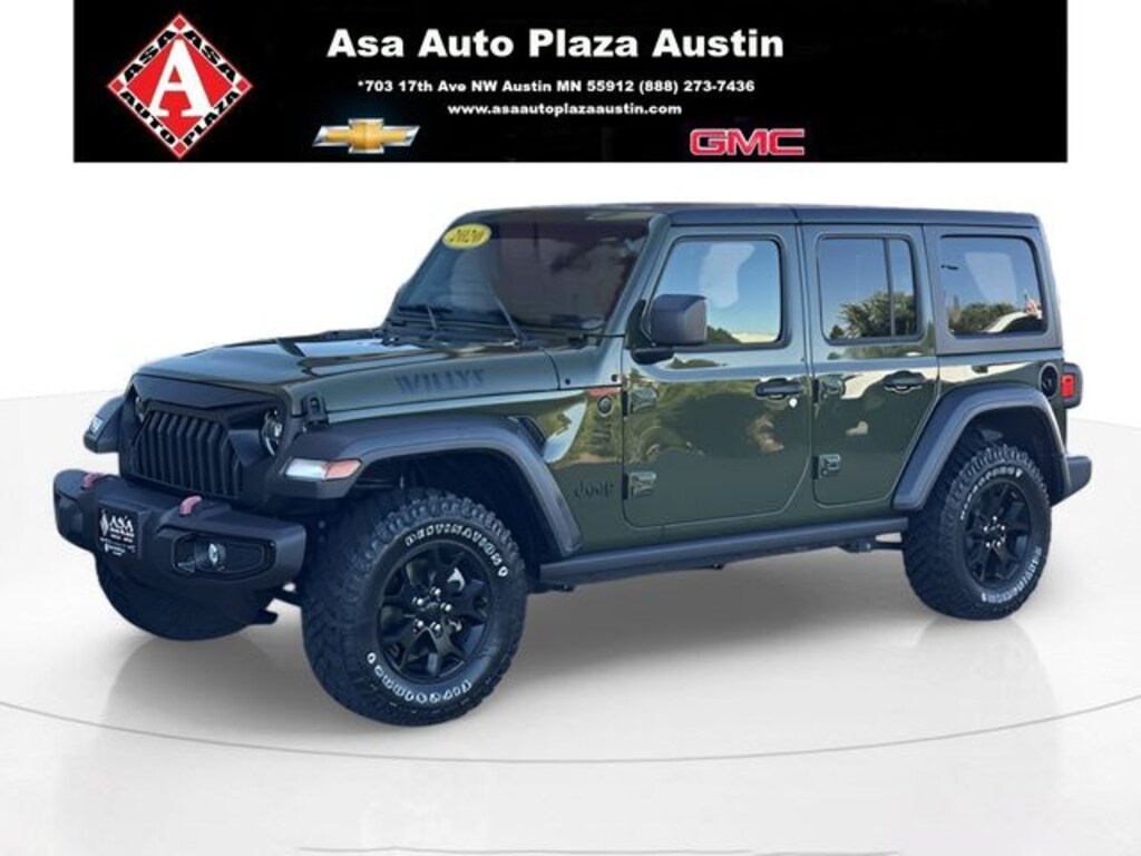 Pure adventure awaits you in this 2020 Jeep Wrangler Unlimited Willys 4WD in pristine Sarge Green Clearcoat with 8-Speed Automatic and capable 3.6L V6 24V VVT. Adventure wrapped in steel with a mud-slinging attitude! This Wrangler Unlimited Willys takes Jeep's legendary off-road heritage and adds a dose of "throw it at me, Mother Nature, I'm ready" spirit! This is a tribute to to the original military Willys that started it all. 17" glossy wheels, chunky off-road tires, bold "Willys" badging, high clearance fenders & rock rails, Rubicon shocks, and still delivers a smooth daily-driver feel. Pop off the doors, fold down the windshield and suddenly you're in an outdoor movie, starring you and the wind! Equal parts nostalgic and unstoppable. It's not just an vehicle, it's a JEEP THING! PLUS Asa Perks at NO CHARGE to YOU! Check out Asa Perks in slide #2 or call us today to learn more about the many free benefits of Asa Perks! (507)433-1871 Asa Auto Plaza of Austin-Your Hometown Family Dealership! Proud to be AUSTIN STRONG!